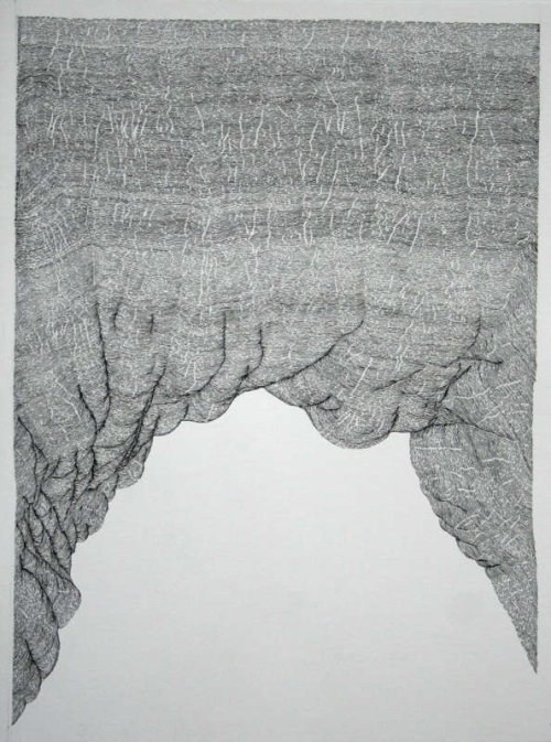 Devant les dessins de cet artiste, l’œil du spectateur échoue dans sa quête du lisible. Il ne dicte plus au cerveau la signification des formes imbriquées. Le temps y perd sa consistance, son nord, sa pointe acérée. Il n’y a pas de chef chez les lignes encordées, pas de cime non plus. L’artiste est au dessin sa maladie et son remède. Il se déploie une nouvelle forme de vie, colonisante et vaccinale, endémique et voyageuse. Un lichen, vous dis-je, à la fois répudiée et source intarissable pour la pharmacopée.