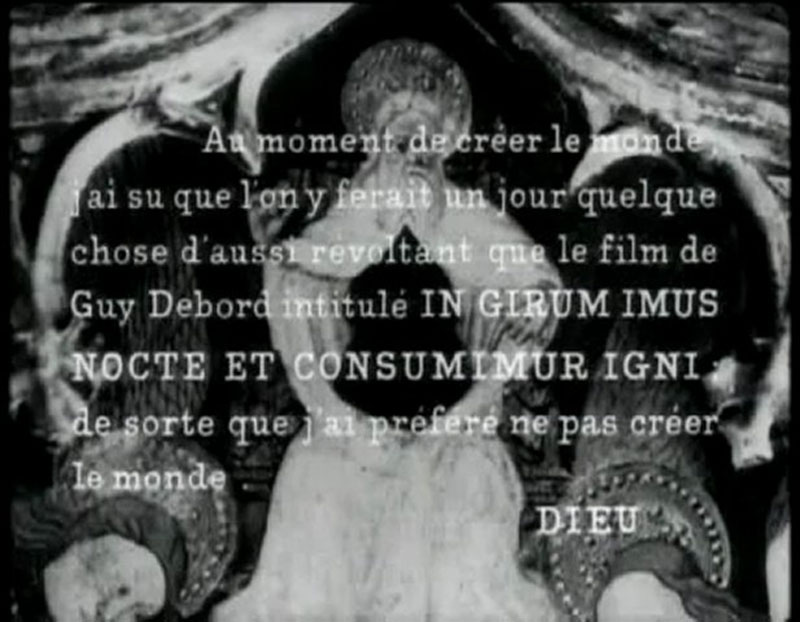 Ce que ce film détruit donc, c’est la perspective temporelle développée par le dispositif de la conscience, dans laquelle s’est déployée l’historie de la pensée, celle du christianisme en particulier et qui surtout sert de légitimation à la société spectaculaire