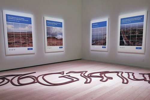 Le triptyque de monochromes de couleurs pures de Naomi B Cook pourrait ne renvoyer qu’à la quête du sublime si chaque pièce ne comportait un texte gravé dans le poly méthacrylate de méthyle. Les mots, réarrangés, proviennent de données. Et ce qui interroge, c’est le contexte de leur collecte. Dans le bleu, il s’agit de mots provenant du rapport sur le fast crash boursier de 2010 que l’on attribue au trading à haute fréquence donnant une place prépondérante aux algorithmes décisionnels dans la finance. Dans le rouge, les mots sont ceux d’utilisatrices ou utilisateurs de l’application de rencontre Tinder où les décisions se prennent d’un geste du pouce ou de l’index. Enfin, dans le vert, il s’agit de courriers électroniques d’un jeu de données qui en compte 600 000. Des mails échangés par des salariés de l’entreprise américaine Enron peu de temps avant sa faillite en 2001. Une affaire dont les malversations comptables firent grand bruit dans les médias de l’époque. Le comble étant que l’Enron Corpus sert, depuis, à entraîner des algorithmes possiblement à même de prendre des décisions, notamment en termes d’optimisation fiscale !