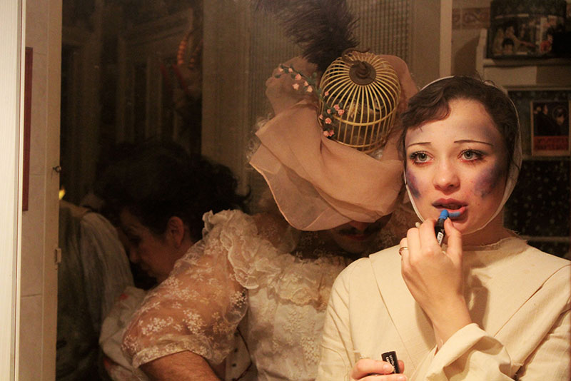 Il m’a semblé évident de commencer l’exposition avec une image de maquillage dans la salle de bain. On y projette autant l’idée de la valorisation, dans une volonté de séduction, régulièrement sexuelle, que celle du devenir-autre, fictionnel, imaginatif, transformant l’appartement en théâtre –ici sur le thème de l’asile psychiatrique au XVIIIe siècle. Et le lieu, la salle de bain, comme espace de recueillement et de discussion intime, comme calme avant (ou pendant) la tempête.