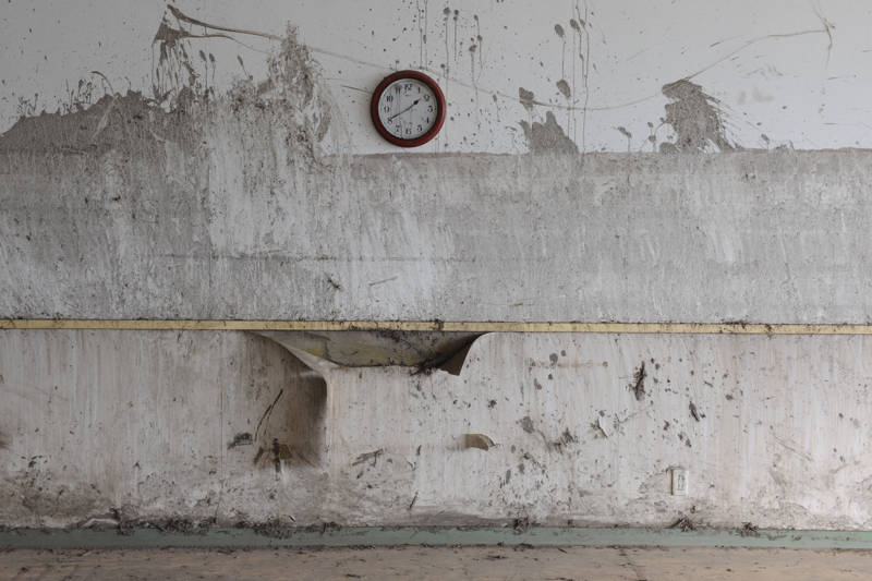 Il me montra une photo. Sur la photo, il y avait une horloge sur le mur de la maison de retraite de Gayahama. Je pouvais voir une ligne à environ un mètre cinquante du sol sur le mur. La partie du mur couverte d’une tache sombre sous la ligne révélait l’attaque du tsunami.