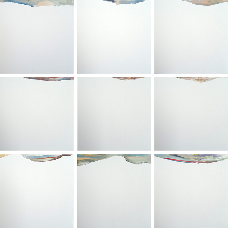 Géraldine Trubert : La série PAROI est pour moi un manifeste. À Bréhat en décembre 2016, lors d’une marche à marée basse, le brouillard est venu envahir la petite crique où je me trouvais. Ce moment de brouillard a fait éclater l’échelle du paysage, a agrandi l’espace. C’est à partir de cette expérience atmosphérique, dont je me suis détachée, que j’ai crée PAROI dans mon atelier à Lyon. Elle n’a plus de contexte, c’est un territoire mental. Comme dans une scène de théâtre où l’on bouge les décors, j’ai joué et inventé du paysage avec trois éléments : l’île, la paroi et le mât. Il s’agit d’ une grammaire. Dans cette série, la paroi raconte la fenêtre, la jetée, le mur, le plateau. Le mât, vertical, oblique ou plat, fait exister un plafond et un sol invisibles. L’îlot raconte un tas, un corps, une communauté, un ancrage, un arrimage.