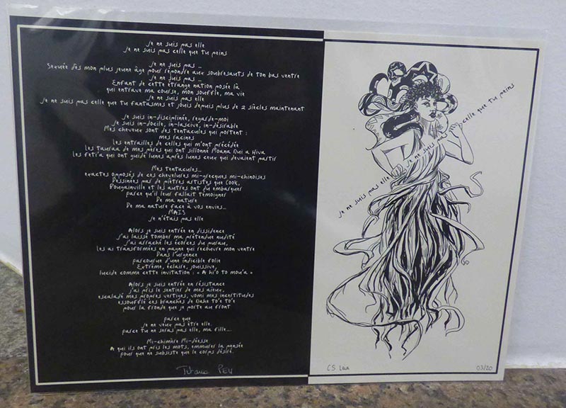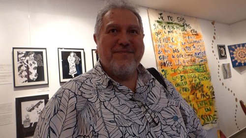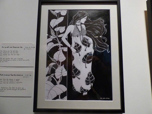 Super. On voit le travail de nos artistes ici à la délégation, donc c’est bien, ça change. Pour moi ça change. Juste après je vais retourner en session à l’assemblée, donc ça me fait du bien à l’esprit de venir ressentir les vibrations artistiques. Carrément du bien. Il y a des styles très différents tu vois. Là on a de l’abstrait total (Patricia Bonnet) et ensuite ici on a quelqu’un (Leia Chang Soi) qui fait plus dans l’illustration mais avec vraiment une touche polynésienne, on sent une sensibilité particulière, ensuite on a les textes de Titaua, la force qu’on connaît des textes de Titaua, mais qui sont enluminés, enfin qui sont mis en graphisme, c’est encore différent, c’est fort… D’ailleurs j’ai craqué.