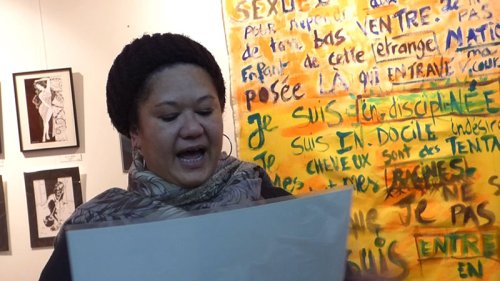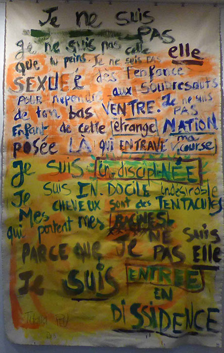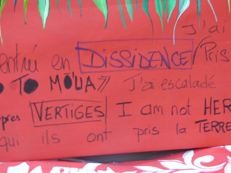 Le soir du vernissage Titaua Peu a fait une lecture très applaudie de son texte Je ne suis pas celle que tu peins. Un texte manifeste efficace qu’elle avait sauvagement calligraphié sur une grande toile flottante, un peu comme une pancarte de manifestation. Qui se termine par Je suis entrée en dissidence. Ce qui est une rupture évidente avec les productions artisanales esthétisantes ordinairement valorisées au numéro 28 du boulevard Saint-Germain, organe du gouvernement polynésien en Métropole. Après la fermeture des portes la soirée s’est poursuivie au Café des Arts de la Cité, pour l’anniversaire de l’un des résidents ultramarins.