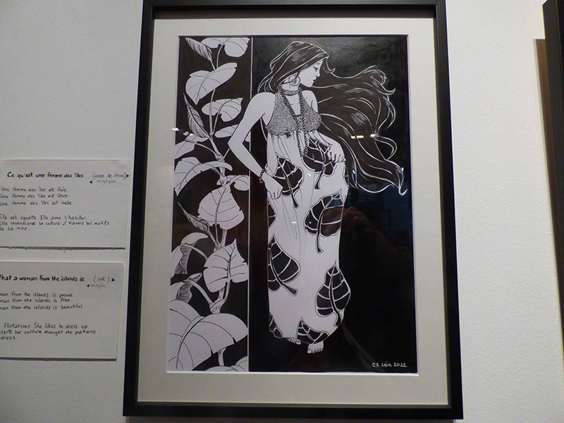 Après ce premier entretien nous sommes allés voir l’exposition de Leia Chang Soi, qui ouvrait ce soir-là son studio au public de la Cité des Arts. Leia présentait en particulier une série d’illustrations intitulée Ce qu’est une femme des îles, accompagnées d’un texte martelant : Une femme des îles est fière. Une femme des îles est libre. Une femme des îles est belle. Elle est coquette. Elle aime s’habiller. Elle revendique sa culture à travers les motifs de sa robe.