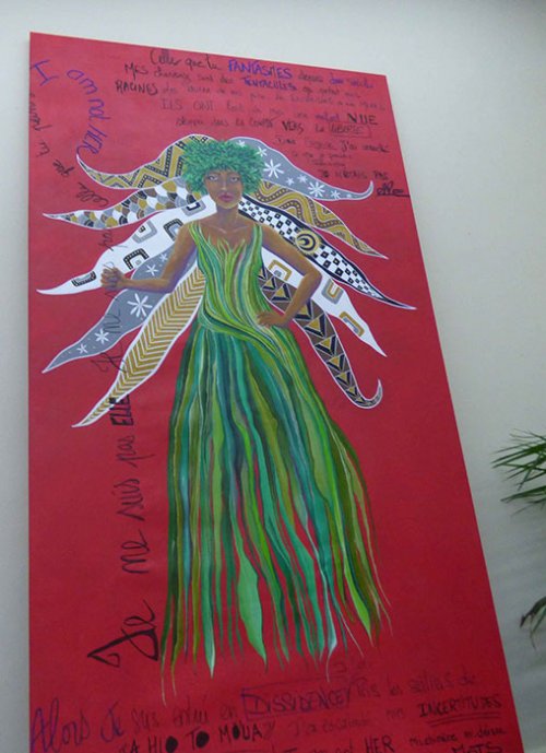 Il m’inspire une divinité noire qui dit bien qu’elle n’est pas la vahine exotique à la Gauguin. Elle entre en dissidence, et elle entre en résistance, et elle court dans la montagne, et elle va chercher tout pour s’habiller, tu vois ça c’est du purau, elle porte des racines sur sa tête qui sont les lignées de ses ancêtres, de ces femmes qui l’ont précédée, et puis la couronne pour se cacher, cacher ses longs cheveux, parce qu’elle ne veut pas qu’on la fantasme, elle ne veut pas qu’on la dénude contrairement à ce qui est dit de nos peuples de l’ancien temps, elle veut s’habiller, elle ne veut pas qu’on la voit nue.