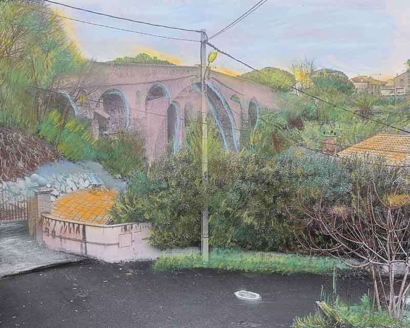 « Le pont du Diable, c’est vrai, je ne croyais pas que j’allais le faire avec du ton rose. C’est pour égayer le pont. Quand je vais voir ma grand-mère, je vois le pont, comme ça, vide, sans rien. J’ai dit en moi-même, Céline, réfléchis à ce que tu vas faire sur le pont. Donc j’ai bien réfléchi, j’ai retravaillé les couleurs. Du vert, du jaune, du rose pour égayer, plus rajouter le portail qui ressort ici et après la route. » Céline Mas