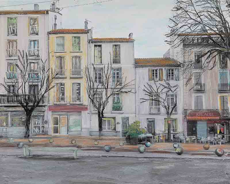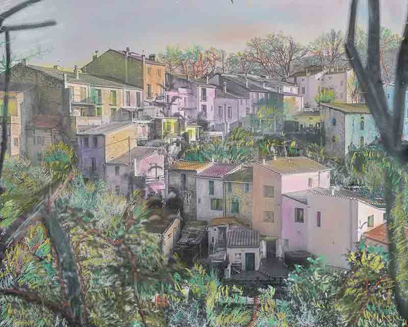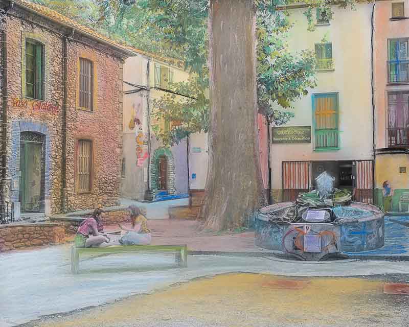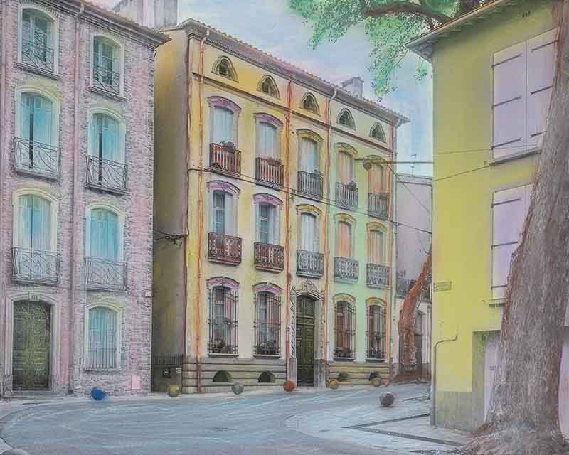 Céline n’habite pas Céret et n’a qu’une connaissance très partielle de son architecture. Elle n’a pas tenté de restituer fidèlement les couleurs de la ville. Et, fondamentalement, cela n’était pas son propos. Ses travaux antérieurs nous l’avaient montré ; le réalisme n’est pas son affaire.