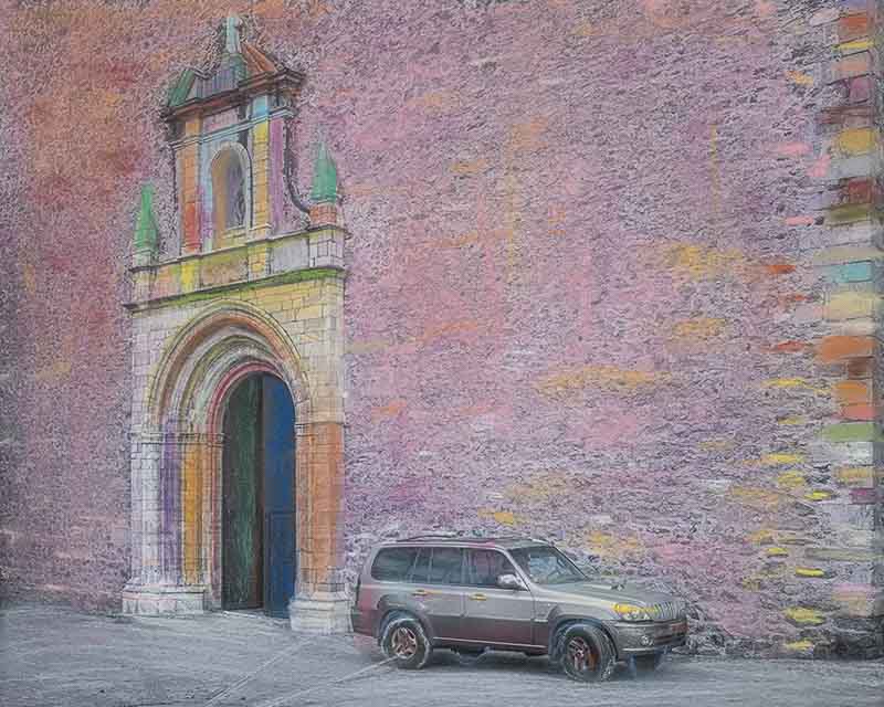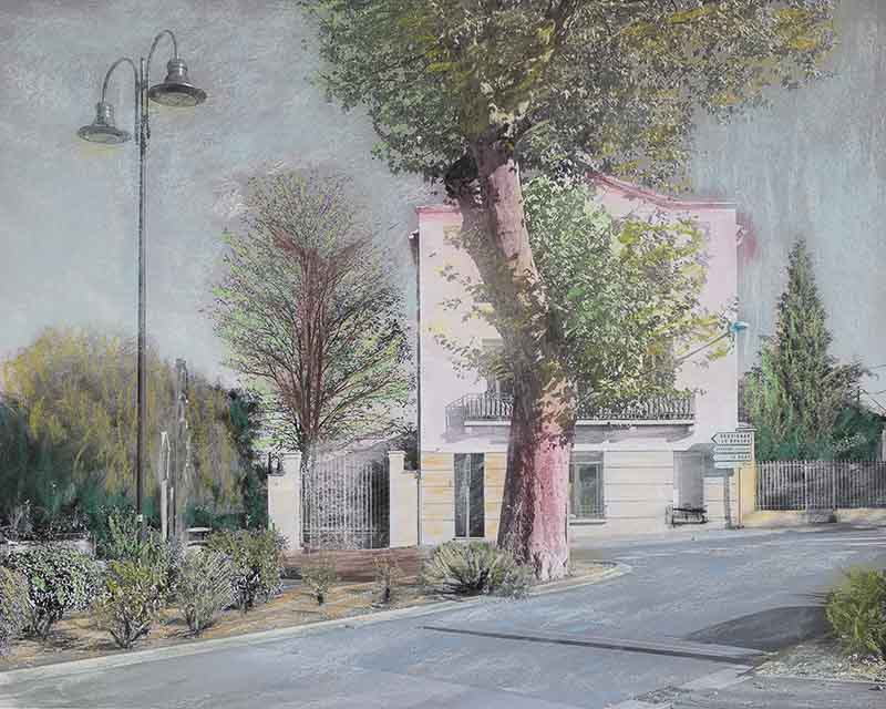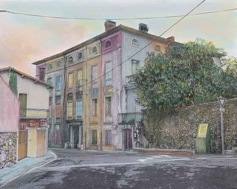 Un premier travail avait abouti à des diptyques juxtaposant mes photographies couleurs et les pastels de Céline. Il portait sur la ville de Pollestres, là où elle vit. La géométrie et les couleurs rigoureuses de mes photographies s’opposaient aux formes déstructurées et aux couleurs fantasques issues de sa vision.