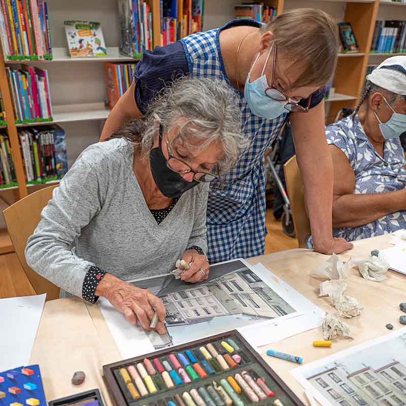 Un atelier intergénérationnel avait été organisé autour de l’exposition à la médiathèque : les participants, résidents en EHPAD et élèves du primaire, étaient invités à appliquer la technique de colorisation au pastel de tirages noir et blanc. Et Céline fut leur professeur. C’est la première fois qu’elle se trouvait en position d’enseignante, elle qui tout au long de sa vie, s’était vu expliquer comme faire ceci ou cela. Céline s’est ainsi trouvée dans une position singulière, inédite, très gratifiante pour elle. Elle en garde un souvenir ému.