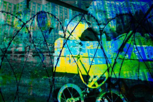 En arrière plan, à quelques exceptions près, il n’y a, soumis au traitement psychédélique d’une coloration acide, que des fonds neutres. Sur ces exceptions figurent en effet un objet du quotidien : landau, palette ou pyramide du Louvre. Sur les autres, fonds irréels, les formes dessinées par les paquets de barbelés sont projetées vers l’avant plan où elles se découpent et semblent tenter d’assaillir l’œil qui s’approche d’elles.