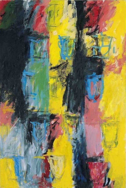 Sur ce seuil, il se tient quand il peint dès le début des années 80 des toiles dans lesquelles la relation entre signe et couleur devient incandescente. Remontant du fond de la toile, du fond des âges, du fond de l’âme, des signes. T-mask II en témoigne avec vigueur. Venant couvrir ce signe et se trouver comme exposé et caché en même temps par un jeu de couleur magistral, il y a la figure humaine, arcane souvent secret mais toujours présent de ses œuvres. Figutr/ornement de 1985 nous livre un peu de ce secret toujours opérationnel aujourd’hui.