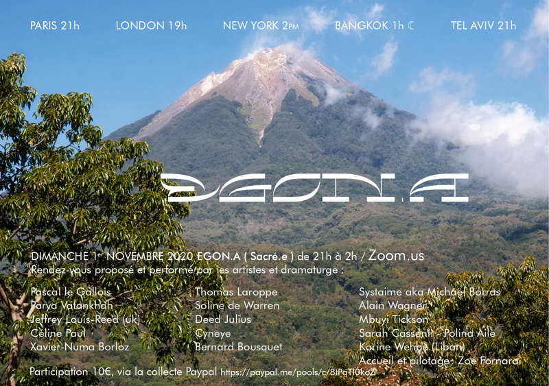 Collectif Egon.a : Zoé Fornara, Maya Arbel (il), Parya Vatankhah, Céline Paul, Soline de Warren, Karine Wehbe (lb), Xavier Numa Borloz, Thomas Laroppe, Pascal le Gallois, Antonio Serna (us), Jeffrey Louis-Reed (uk), Alain Wagner, David Coignard, Deed Julius, Cyneye, Mbuyi Tickson, Mogly Speix, Michaël Systaime Borras, Sarah Cassenti <3 ** * Zoé Fornara, tel un personnage extrait de Twin Peaks, pilote zoom pour nos entrées, accueille les participants.