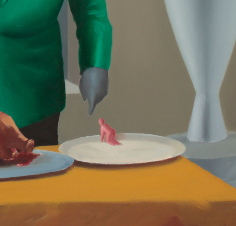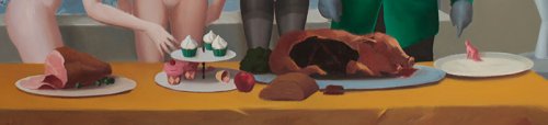 Mais que fait, devant cette table, un homme sans tête et donc sans bouche mais dont la forme ressemble à s’y méprendre à celle des tortillons de crème qui ornent les gâteaux ? Et que font ces trois femmes érotisées par leur totale ou partielle nudité et qui semblent ne pas tant être là pour consommer, que pour assister à une opération indécidable ? Mais toujours une petite faim tenaille.