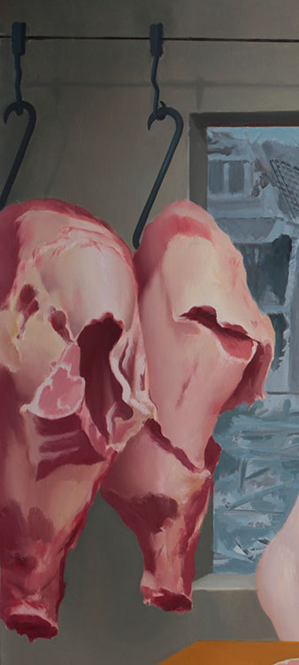 Défilent sur cette scène, donc, de gauche à droite, des femmes dont il faut invariablement se demander si elles ont répondu une à une à l’appel prenant position sans y être conviées ou si elles apparaissent conformément au déroulé d’un défilé de mode. La présence de crochets de boucher vides nous incite à voir, dans la succession des éléments qui de la droite de la table à la gauche et inversement, forment une frise digne d’un temple grec recomposé dont la logique répond à un dessein visant à l’immortalité.
