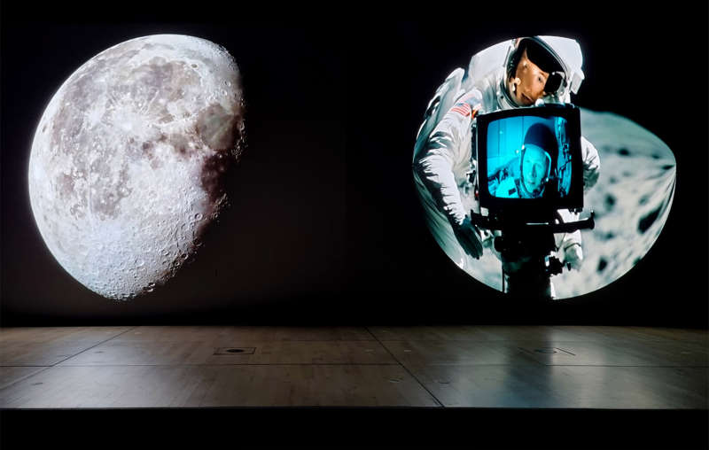 C’est avec une performance audiovisuelle d’Alain Thibault que l’exposition En d’infinies variations a été inaugurée au Centre culturel canadien à Paris. Intitulée Apollo 11 Dream, elle est rythmée par les bips qui renvoient au 21 juillet 1969, jour d’alunissage. Quand les échanges étaient ponctués par des sons stridents symbolisant l’éloignement à tout jamais. Des voix de synthèse déclament les mots des deux astronautes pendant que la Lune en rotation ne quitte que rarement notre champ de vision. Ce n’est que lorsque la voix de Houston se répète, comme s’il y avait un bug dans la mission, que l’on saisit la force des perturbations dans les images comme dans les sons. Cette performance, depuis son tout début, nous extrait d’une réalité historique pour nous proposer des alternatives à même d’enrichir nos imaginaires. « It’s different but it’s very pretty out here », s’exclame l’un des deux explorateurs. Mais quel est cet ailleurs de tant de beauté dont l’humanité tout entière semble se "protéger" depuis 1972, date à laquelle des astronautes américains ont foulé la poussière lunaire pour la dernière fois.
