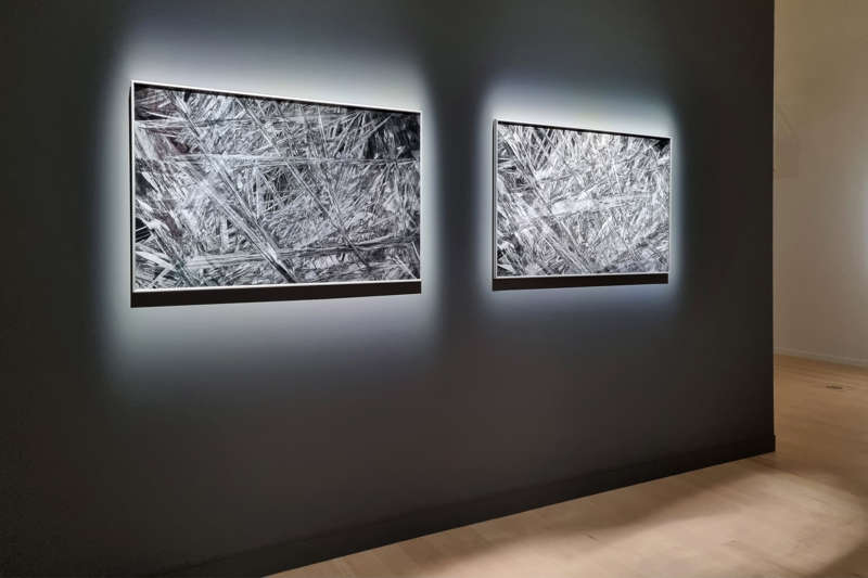 La série Anamorph-Lattice de Georges Legrady se compose de panneaux lenticulaires qui, par conséquent, recèlent d’autant de représentations qu’il y a de points de vue dans l’espace de l’exposition. Même immobiles, nous percevons la profondeur de telles images, composées initialement de photographies de famille d’une inquiétante insouciance, car prises en Hongrie en 1940 alors que le monde s’enfonce inexorablement dans la guerre. Ces instants photographiques d’avant l’horreur, l’artiste les a multipliés en les disposant au sein de l’espace tridimensionnel virtuel d’une application qu’il a développée selon le modèle du mathématicien Gueorgui Voronoï. Ainsi anamorphosés, ils convoquent l’histoire de la représentation en peinture, et on pense inévitablement aux Ambassadeurs d’Hans Holbein le Jeune. Leurs assemblages nous apparaissent infinis en termes de possibilités mais Georges Legrady n’en saisit que quelques-unes. Les compositions génératives qui en émergent sont résolument abstraites, bien que les enchevêtrements des pics qui abrasent nos rétines évoquent les cristaux présents dans les grottes de Naïca au Mexique, tandis que leur texture renvoie aux marqueteries de bois des perspecteurs italiens de la Renaissance.