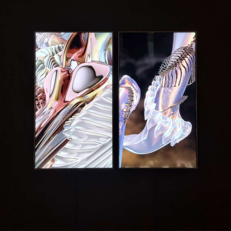 Alors que nous retenions toutes et tous notre souffle en 2020 pour cause de pandémie, Salomé Chatriot a enregistré le sien pendant une performance où elle était allongée sur un tronc d’arbre. En 2021, elle restitue ses données respiratoires via deux séquences 3D de la série Breathing Patterns, ce qu’elle répétera à chaque itération de telles performances. En 2023, c’est sous la neige et en altitude qu’elle hyperventile. Les deux écrans vidéo nous permettent de visualiser des rythmes différents traduisant des états émotionnels distincts. Où le chaos d’une respiration irrégulière, d’un côté à l’autre, se dissipe pour donner place à ce qui exprime la sérénité. Ses “organes”, qui ne correspondent en rien à l’idée que l’on se fait de nos systèmes respiratoires, apparaissent comme des prolongations du corps de l’artiste qui, virtuellement, poursuit sa performance. Comme si elle avait délégué son souffle, expression de l’intime, aux objets techniques qui la prolongent artificiellement. A l’inverse de ce qui se produisit en 2020 quand des artifices assistaient les humains, l’artiste insuffle vie à des organes de synthèse.