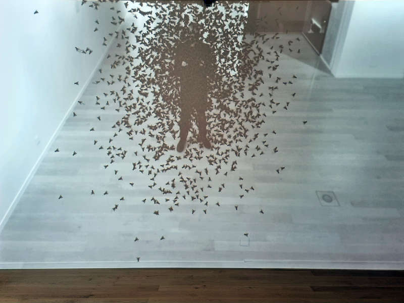 People on the Fly des artistes Christa Sommerer et Laurent Mignonneau est un dispositif vidéo en circuit fermé que le public active par sa présence. L’installation interactive se comporte tel un miroir à une différence près, les couleurs sont désaturées, comme pour signifier qu’il ne s’agit pas tout à fait de la réalité. Ce qui se vérifie lorsque la caméra de l’œuvre décèle une présence dans l’espace de l’exposition qui lui fait face. Celles et ceux qui entrent dans l’image se voient alors assaillis par des essaims de mouches virtuelles. Le spectacle du vivant qui se joue en surface de cette installation vidéo incite les participantes et participants à interagir selon différentes stratégies. Les uns restent immobiles pour littéralement disparaître, les autres cherchent à attirer les insectes ou encore espèrent les éviter, ce qui est peine perdue. Le véritable sujet de cette œuvre ouverte est le public lui-même qui la complète, si ce n’est la parachève par sa simple présence.