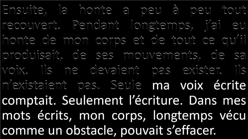 La recherche-création, c’était la meilleure réponse pour moi. J’avais le sentiment d’avoir un conflit intérieur, je sentais qu’il y avait des choses dont j’étais dépossédée. Le doctorat m’a permis de mieux appréhender le fait qu’on ne m’a pas transmis ma langue, qu’on ne m’a pas transmis l’histoire de ma communauté. Ça m’a permis de comprendre le monde comme il fonctionne à travers la présence ou l’absence des personnes sourdes dans la société et en même temps, de faire ce lien entre mon vécu de l’oppression au quotidien et mon travail sensible. Je m’intéresse aux relations de pouvoir, à la façon dont la violence s’exprime. J’essaye de prendre des bouts de ma vie quotidienne et chaque événement, de le déplier, de le décortiquer, de faire une petite opération chirurgicale sur ces moments vécus d’oppression et de discrimination. La méthode scientifique et l’approche sensible de l’art sont, pour moi, totalement complémentaires.