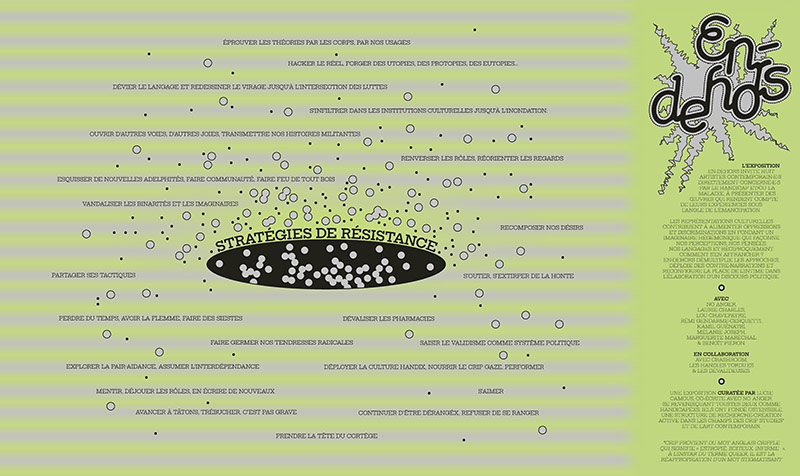 L’exposition En-dehors invite huit artistes contemporain·e·s , No Anger, Laurie Charles, Lou Chavepayre, Rémi Gendarme-Cerquetti, Kamil Guénatri, Mélanie Joseph, Marguerite Maréchal et Benoît Piéron, ainsi que trois collectifs, Crashroom, les Handi.es Tordu.es, les Dévalideuses, directement concerné.e.s par le handicap et/ou la maladie, à présenter des œuvres qui rendent compte de leurs expériences sous l’angle de l’émancipation.