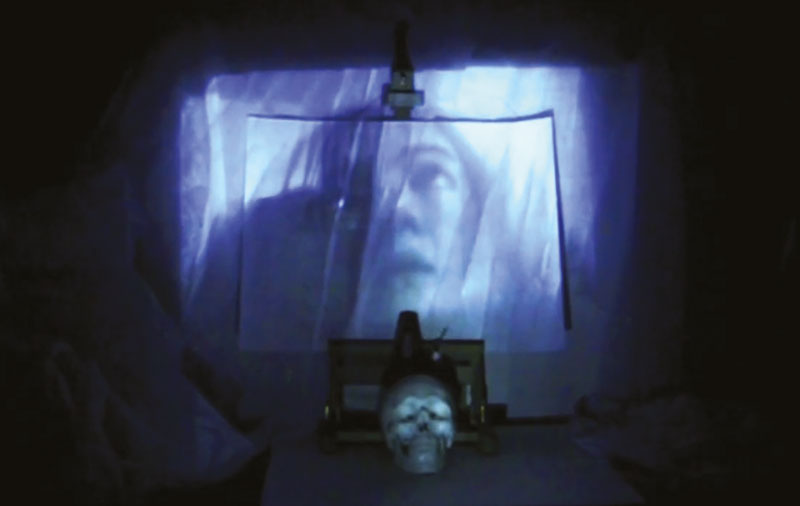 Memento Fuit hic n°3, 2019, installation avec projections vidéographiques, écran, crâne, chevalet, voile, cadre, ventilateurs, métronome, intégrant un film : Memento Fuit hic, film numérique, durée : 5’44, 2015 et Memento Frari 1 et 2, films numériques, 5’44, 2017, photographies. ©Pierre Juhasz.