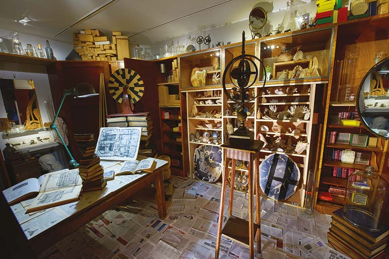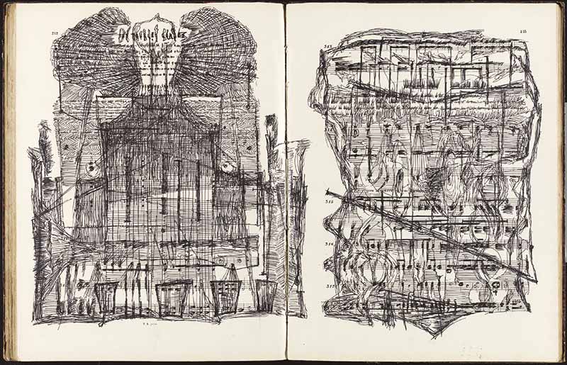 C’est quoi ce fourbi ? Pourrait-on se demander face à cette construction. Hervé Bacquet crée un espace-lieu totalement confiné dans l’angle d’un appartement, un mur a été érigé, un rempart fait de livres, de journaux et de boîtes qui semble cacher quelque chose. Une horloge tinte de temps en temps mais l’endroit paraît abandonné. De place en place, de petites ouvertures permettent de distinguer des objets dans la pénombre : des tubes à essai entreposés dans un petit cabinet de toilette, une penderie pleine à craquer, un petit escabeau en bois qui peine à supporter un monceau de dictionnaires. Qui vit là ? Un écrivain ? Un inventeur ? Un ermite ? Un ogre ? Vingt dessins sur livres sont suspendus au mur. Des textes ont été choisis pour leur capacité à respirer. Le dessin visible sur ces doubles pages se nourrit de chaque lettre ou de chaque note mais aussi des interstices et de leur densité. La ligne s’infiltre, elle sature et désintègre la lecture. La page mute, elle se referme et s’atomise à l’infini.
