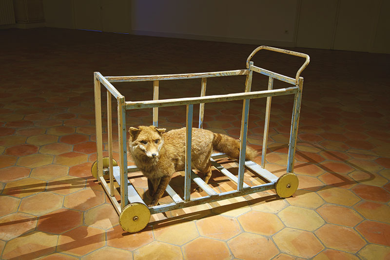 La nuit du chasseur, Carcasse de landau, renard empaillé, 76 x 96 x 50 cm / 29.92 x 37.8 x 19.69 cm, 2016, © Claude Lévêque, Courtesy Claude Lévêque Kamel Mennour.