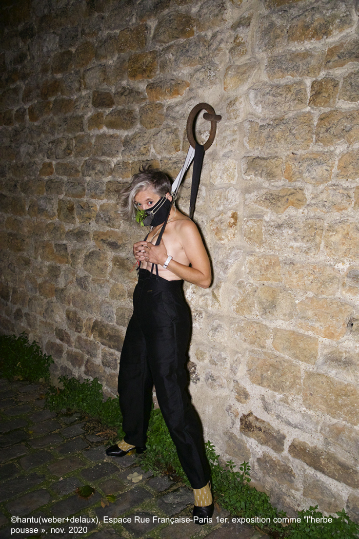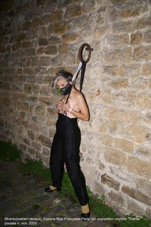 Pascale Weber : Le rituel c’est une performance, lorsque c’est une action que l’on mène sans pouvoir anticiper ses prolongements, une action qui nous transcende, que l’on commence à comprendre au moment où on agit. Il y a une envie, un besoin, une énergie à la base, le désir de remettre les énergies dans le bon ordre, de permettre que l’énergie re-circule là où l’on sent qu’il y a un blocage, une pression, une difficulté à respirer, une peur, une angoisse, Comme là sur ces photographies (série « comme l’herbe pousse ») réalisées pendant le premier confinement, ce sentiment d’insécurité encore, performer torse nue dans la rue la nuit en bravant l’interdit de sortie en déambulant autour de la Rotonde, place connue pour le commerce du crack à Paris. Des migrants drogués abandonnés avançant comme des zombies dans les rues vides. Besoin de traverser cet espace et d’affronter cette peur insupportable et ce sentiment d’oppression pour reprendre ensuite mon souffle.