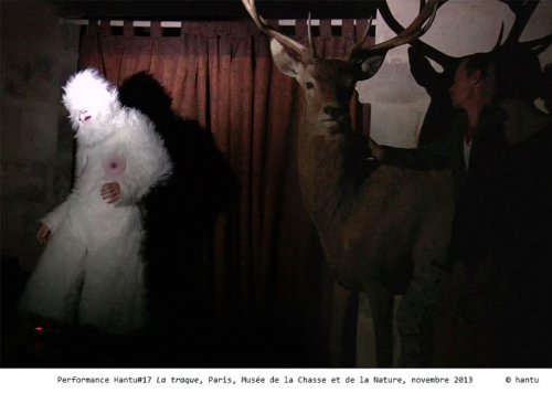 La violence de l’institution n’a rien de comparable naturellement mais elle n’est pas moins à l’origine d’une auto-censure. Nous avons performé au Palais de Tokyo (Incorporations, L’Humain débordé n°2, séminaire performatif, 17/06/2013 ; Homo Erectus, 2013), au Musée de la Chasse et de la Nature (La Traque, dans le cadre du colloque Performances et animalités, 13-14/11/2013), aux Beaux-Arts de Saint-Pétersbourg (Colloque « Nouvelles formes de présences dans la performance », 1-2/06/2017)… Il serait mal venu donc que je critique l’institution, pourtant je m’interroge sur la fonction et le statut des performances réalisées dans ce cadre.