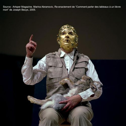 P : Oui, car cette construction, cette mythologie, c’est la seule chose qu’on ne peut pas s’approprier (par « re-enactment »). Beuys fait de son existence une sorte d’institution biographique, Lorsque Marina Abramovic refait sa performance (« Comment expliquer les tableaux à un lièvre mort »), elle déjoue une part du récit de la performance de Beuys en s’invitant dans son histoire. En fait, j’ai l’impression qu’elle devient elle-même une institution en faisant cela : incarner la mémoire vivante d’un monstre disparu, un exercice de style qui ne risque pas de se heurter à l’incompréhension ni la critique auxquelles l’œuvre originale a déjà répondu.