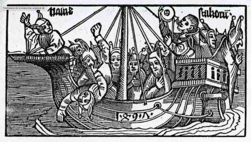 Moi-même j’ai été questionné par cette image que je connais assez bien, me permis-je d’intervenir, et je perçois dans cette architecture folle une version « moderne » de la Nef des fous, « Das Narrenschiff » de Sébastien Brant [9], un texte de la Première Renaissance, qui a été si merveilleusement illustré par Albrecht Dürer, ou bien du tableau éponyme de Hieronymus Bosch, antérieur à « Das Narrenschiff » dénonçant la turpitude et les vices des gens d’église et des Hommes de son temps. La Nef des fous ! Ce fut là un grand succès d’édition, c’est certain, mais aussi une image qui trottait dans la tête de beaucoup à la fin du Moyen Âge et au début de la Renaissance, à commencer par celle d’Érasme de Rotterdam qui, lui, ne parle pas de la nef mais bien de la folie des gens d’église et des Hommes de son temps.