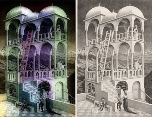 La Tessellation est une division rythmique de l’espace, cela a été dit, et c’est ce qui a tant fasciné Escher, évidemment. Il a fait quantité de croquis des mosaïques andalouses et à partir d’eux il a analysé les mouvements des tesselles, translations, rotations, glissements, homothéties [6], et les combinaisons de ces mouvements. Il a procédé à leur « lecture » comme on ferait d’une partition musicale. Une mosaïque comme une musique étant une totalité bien supérieure à la simple juxtaposition de ses composants, tesselles ou notes, Escher a apporté beaucoup de soin à l’homogénéité, à l’harmonie, de ses propres compositions, ses gravures. Au moyen de la Tessellation, il a développé les thèmes qui lui étaient chers, ses « concepts » artistiques, les métamorphoses, les cycles, l’interpénétration des mondes, mais il a aussi lancé un défi à la perception. Expérimentation du gestaltisme ! [7].
