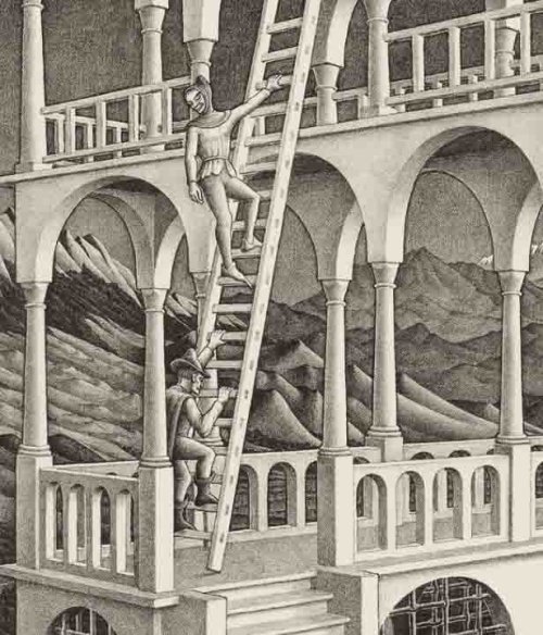 Une architecture, ma préférée peut-être parce qu’elle fait appel au cube de Necker, mais en version impossible, c’est « Belvedere », une autre lithographie. Escher nous transporte dans un Moyen Âge d’opérette avec des acteurs qui sont tous bizarrement fagotés. Le belvédère en question ressemble peu ou prou à un tout petit palais moghol surmonté de trois coupoles et constitué uniquement de deux plateformes en étage à partir desquelles on dispose d’une vue panoramique sur un majestueux paysage des Abruzzes, de belles montagnes.