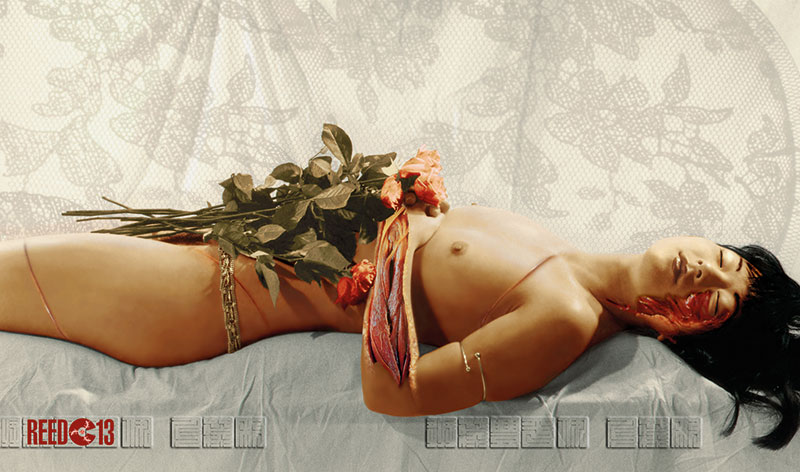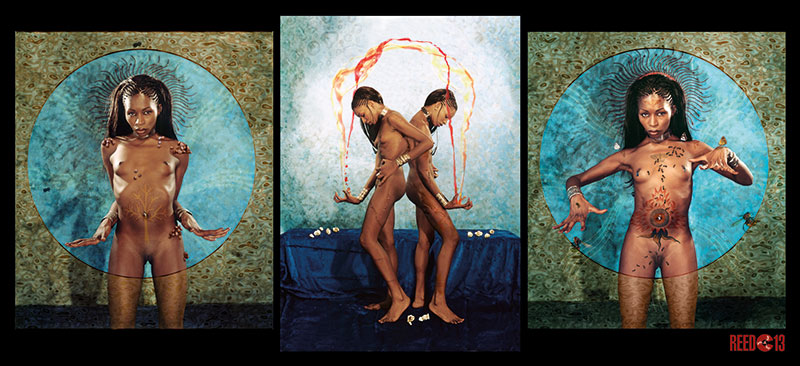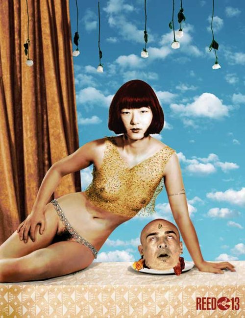 Tout comme les instantanés, issus de la prise de vue, se retrouvent pris dans un jeu de trans-formation descendant en droite ligne du symbolisme et du surréalisme (en adoptant une forme classique et figurative et en contraignant à des résultats paradoxaux un genre réaliste censé représenter la réalité), ce processus de détournement affecte des concepts et des références à des œuvres repères de l’histoire de l’art. Cette pratique iconoclaste est aussi un hommage et reflète mes goûts personnels. Il est notable de constater qu’il s’agit surtout d’œuvres picturales et non pas photographiques comme Salomé (transposée en Asie avec des motifs viennois art déco), St Sebastiane (dont la représentation habituelle à connotation homosexuelle est réinterprétée au féminin hétérosexuel), l’école de Fontainebleau (Gabrielle d’Estrées et sa sœur) dont l’interprétation du geste de la duchesse de Villars, signifiant que Gabrielle d’Estrées est enceinte, est brouillé par les piercings au mamelon et par la présence de masques de carnaval en arrière plan au lieu de la servante cousant une layette : Gabrielle.