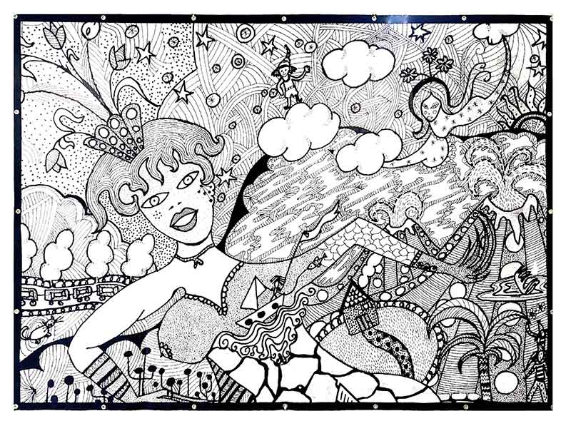 Comme un alien qui pousserait dans mon ventre, mais pas un alien négatif et monstrueux... Juste une création intérieure et virtuelle qui se matérialise peu à peu... C’est vraiment étrange car il n’y a aucune volonté de ma part, si ce n’est juste la volonté de ne pas m’y opposer... L’acte de création peut se manifester de différentes façons. Parfois il me suffit de juste me poser quelque part avec une feuille de papier et un stylo et tout vient dans un flux sans ratures... Pour la peinture aussi parfois juste de la peinture fluide et un pinceau... Parfois, l’impression que je ne suis pas en état de « réceptionner » et dans ce cas, je ne le tente même pas... Mais dès que je me sens en « état réceptif » même si c’est dans un café très bruyant, les choses viennent d’elles-mêmes... dessin, peinture ou écriture…