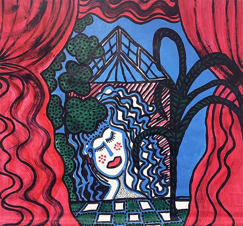 Un nouveau tableau, bien central, attire cependant l’attention, il paraît être l’expression d’un autre talent et pourtant, non. Ce Portrait de Jeanne Moreau, datant de 1974, est bien l’œuvre de Catherine Belkhodja, attestant des mues successives de l’artiste qui, non contente d’exceller dans différentes formes d’art, nous administre ici la preuve qu’au sein même de la peinture elle a su se renouveler, transformer et sa perception et son art.