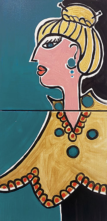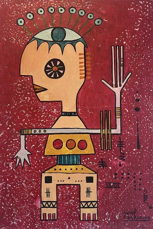 Une fois passé la porte de l’espace d’exposition, l’œil est accroché par la diversité des œuvres exposées, le regard ne sait plus où se poser, raison pour laquelle il s’attarde d’abord sur les grands formats acryliques : la Jubilante, bien sûr, qui donne son nom à l’exposition : grand monochrome (201x300cm) qui se déploie généreusement sur un mur mais aussi La Clé des Songes (150x150 cm) et puis des œuvres plus petites, exubérantes, colorées, généreuses comme l’artiste ; des séries qui, à l’instar de celle Les 3 Yeux (gravure, peinture) témoignent d’expérimentations formelles (de décadrage par exemple), certaines œuvres rappellent que Catherine Belkhodja est passée, pendant son parcours de formation long et varié par l’école des icônes orthodoxes russes...