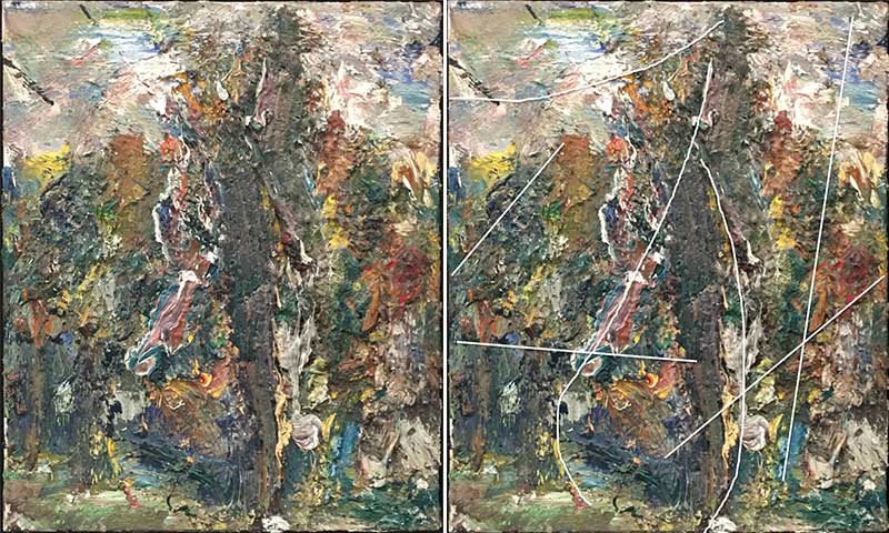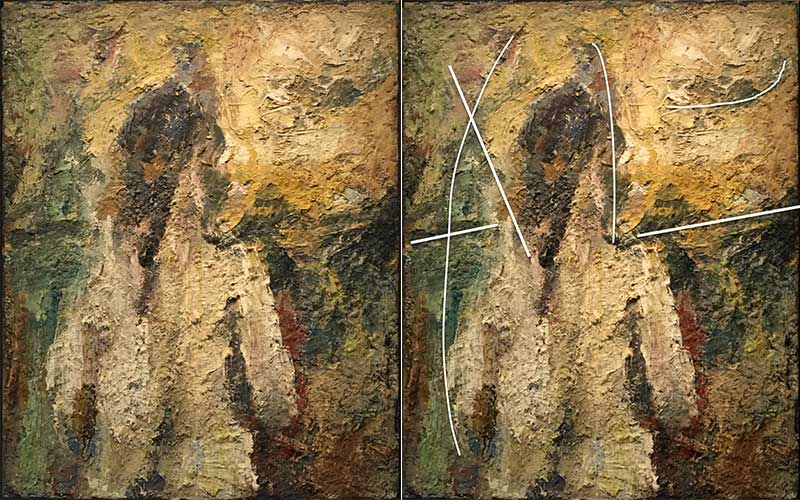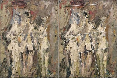 Je suppose que si la plupart des gens ne voient pas ces structures latentes, c’est parce qu’ils n’observent pas assez longtemps les œuvres… ou que leur œil n’est pas habitué à remarquer les subtilités de ce type. Précisons que si indiquer de visu ces liens peut s’envisager cela reste difficile à transmettre dans un texte puisque presque impossible à formuler avec des mots. Les traits fins ajoutés sur quelques illustrations accompagnant ce texte tentent d’indiquer certaines directions parcourues par un regard en recherche.