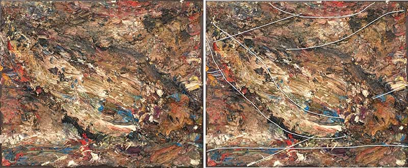 En aucun cas les tracés latents signalés ici ne prétendent être uniques ni même constituer les marques principales. Rien n’assure non plus le regardeur de la pertinence de ses choix. Un point de départ quelques millimètres à droite ou à gauche induirait sans doute la découverte d’autres lignes latentes. Il suffit que quelqu’un d’autre, ou la même personne quelques minutes plus tard, choisisse l’autre côté de la touche pour que cela l’amène à découvrir d’autres liaisons…
