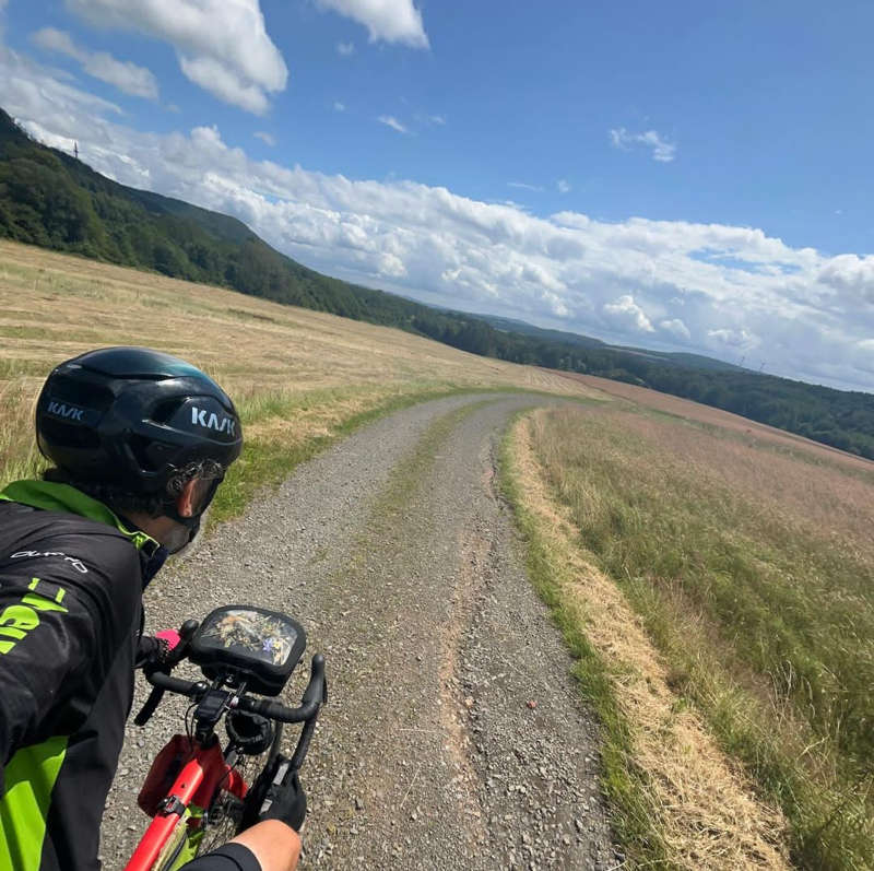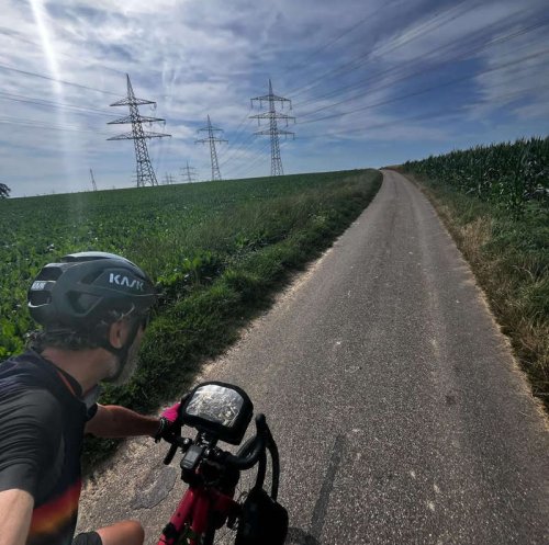 Je suis aussi la tortue. Je prends le temps tous les jours d’écrire six pages de diary dans mon cahier à lignes, d’appeler mon inouïe, d’appeler mes kidzzz en vacances ou pas, estivales, de faire des pauses et des détours pour photographier une fleur, une piste, un champ, une industrie et moi au milieu. De prendre 15 jours pour faire Paris-Nuremberg, alors que ça prend 1h30 en avion, 6h30 en train, 7h30 en automobile. En étant plus direct, je n’aurais peut-être mis que 8 jours. Ce qui compte, ce n’est évidemment pas la destination, c’est le trajet, le voyage.