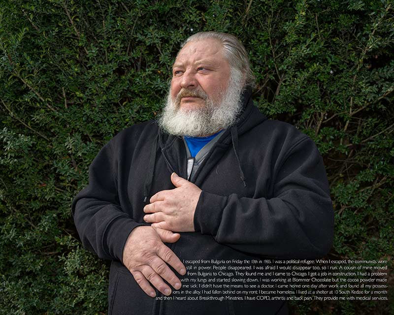 I know I can just wander around the streets and photograph, but given the sensitive nature of this subject, I’ve decided it’s best to work with non-profit organizations that deal with homelessness every day. To this end, I’ve been working with the Chicago Coalition for the Homeless, which has helped me identify individuals to photograph and interview. I’ve learned from CCH and other organizations that homelessness takes many more forms than just living on the streets and that many other factors besides mental illness and drug/alcohol addiction are causes for this problem.