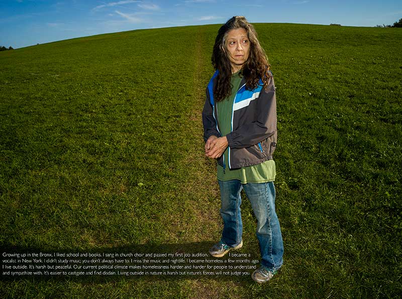 I had a job soldering pinball machines. I was a vocalist in New York. I sang in church choir and passed my first audition. I didn’t study music ; you don’t always have to. I liked school and books and studying. I miss the music and nightlife. I became homeless months ago. I live outside. It’s harsh but peaceful. Our current political climate makes homelessness harder and harder for people to understand and sympathize with. It’s easier to castigate and find disdain. Living outside in nature is harsh but nature’s forces will not judge you.