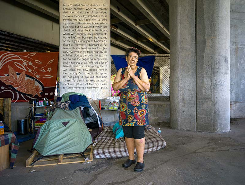 I first became homeless when my mother died ; then my dog died. My stepdad is an alcoholic ; he’s evil. I’m a Certified Nurse’s Assistant. I told him to bring my mom to the nursing home where I worked, but he wouldn’t. She had diabetes, always helped me with money. When she died I couldn’t go back to her house, which was my grandparent’s home. I left my boyfriend—he cheated on me. I got a new job as Certified Nurse’s Assistant at Harmony Healthcare at Pulaski and Foster. The residents are elderly.