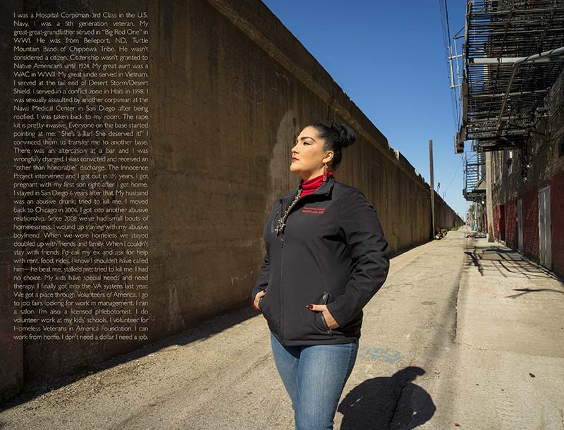 I was a Hospital Corpsman 3rd Class in the U.S. Navy. I was a 5th generation veteran. My great-great-grandfather served in “Big Red One” in WWI. He was from Belleport, ND, Turtle Mountain Band of Chippewa Tribe. He wasn’t considered a citizen. Citizenship wasn’t granted to Native Americans until 1924. My great aunt was a WAC in WWII. My great uncle served in Vietnam. I served at the tail end of Desert Storm/Desert Shield. I served in a conflict zone in Haiti in 1998. I was sexually assaulted by another corpsman at the Naval Medical Center in San Diego after being roofied. I was taken back to my room. The rape kit is pretty invasive. Everyone on the base started pointing at me—“She’s a liar ! She deserved it !” I convinced them to transfer me to another base. There was an altercation at a bar and I was wrongfully charged. I was convicted and received an “other than honorable” discharge. The Innocence Project intervened and I got out in 1½ years. I got pregnant with my first son right after I got home. I stayed in San Diego 6 years after that. My husband was an abusive drunk ; tried to kill me. I moved back to Chicago in 2006. I got into another abusive relationship. Since 2008 we’ve had small bouts of homelessness. I wound up staying with my abusive boyfriend. When we were homeless we stayed doubled up with friends and family. When I couldn’t stay with friends I’d call my ex and ask for help with rent, food, rides. I know I shouldn’t have called him—he beat me, stalked me ; tried to kill me. I had no choice. My kids have special needs and need therapy. I finally got into the VA system last year. We got a place through Volunteers of America. I go to job fairs looking for work in management. I ran a salon. I’m also a licensed phlebotomist. I do volunteer work at my kids’ schools. I volunteer for Homeless Veterans in America Foundation. I can work from home. I don’t need a dollar, I need a job.