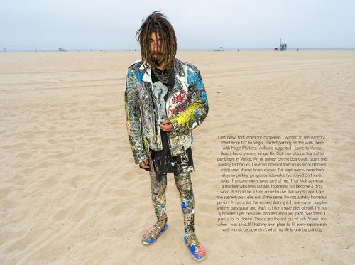 I left New York when 9/11 happened. I wanted to see America. Went from NY to Vegas, started painting on the walls there with Magic Markers. A friend suggested I come to Venice Beach. I’ve drawn my whole life. Got into tattoos. Started to paint here in Venice. An oil painter on the boardwalk taught me painting techniques. I learned different techniques from different artists who shared brush strokes. I’ve slept everywhere from alleys to parking garages to sidewalks. I’ve stayed on friends’ sofas. The community takes care of me. They look at me as a resident who lives outside. Homeless has become a dirty word. It should be a hate crime to use that word. I don’t like the stereotype ; we’re not all the same. I’m not a shitty homeless person. I’m an artist. I’ve earned that right. I have my art supplies and my bass guitar and that’s it. I don’t have piles of stuff. I’m not a hoarder. My work is fun. I like a certain depth of texture. I get canvasses donated and I just paint over them. I paint a lot of clowns. They scare the shit out of kids. Scared me when I was a kid. I sold a big painting the other day and a leather trench coat that I painted a mural of clowns on. If I had my own place I’d fill every square inch with murals because that’s what my life is : one big painting.