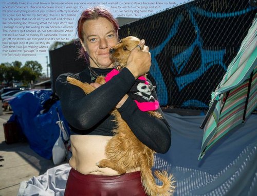 I became homeless about 5 years ago. I’m a hillbilly. I lived in a small town in Tennessee where everyone was kin to me. My mom never did like me. I wanted to come to Venice because I knew my family wouldn’t come here. You have to watch it—the gangs and stuff. I’m here with my husband. I’ve had my dog, Sadie Mae, for a year. Got her for my birthday.