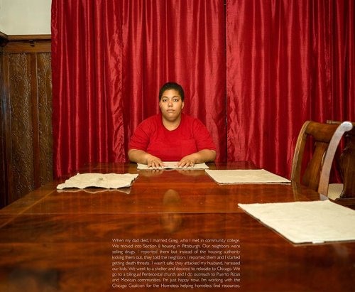 People live doubled up with friends or family (it is estimated that 18,000 kids in Chicago Public Schools are homeless) ; in short or long-term shelters ; in hospitals or SRO’s (Single Room Occupancy hotels). There are homeless veterans ; individuals and families who were evicted when their residences were foreclosed on ; people who had sudden and serious medical expenses that insurance didn’t cover, wiping out their life savings. Job loss, divorce, death of a spouse, domestic violence, lack of affordable housing all drive homelessness. There are working poor who live in tents or their vehicles because housing near their workplace is unaffordable. It is essential that I cover as wide a range of individuals as possible in order to tell a more accurate story.