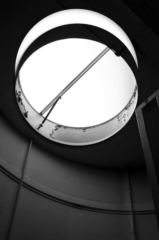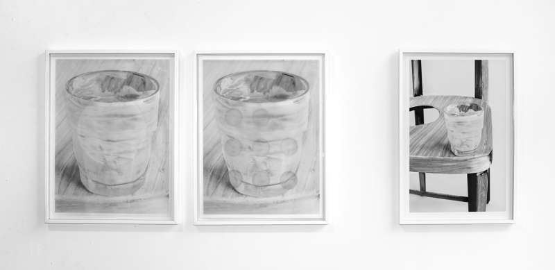 Associée en un diptyque avec la photographie de l’anneau du skydome d’un escalier, l’image trouée montre qu’elle peut devenir plus que ce qu’elle montre. Ou bien, l’effet inverse d’occultation par de légers voiles superposés devant l’image laisse deviner un verre « peint » au bord d’un support trois fois de manière légèrement différente, en aboutissant, dans le sens habituel de la lecture, à une image qui révèle la véritable situation de l’objet, posé sur le bord d’une chaise. Mais cette fois, c’est la chaise qui est trouée. Le trou apparaît ici pour ce qu’il est, la matérialisation du manque interne à toute vision.
