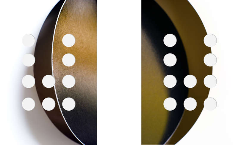 Gros plan sur un rond découpé dans une feuille de papier marron, la partie découpée est replacée sur le trou de son origine. Décalage, incompatibilité entre les morceaux, Philippe Soussan pousse le face à face avec cette réalité intraitable en découpant l’image finale de petits trous bien ordonnés.
